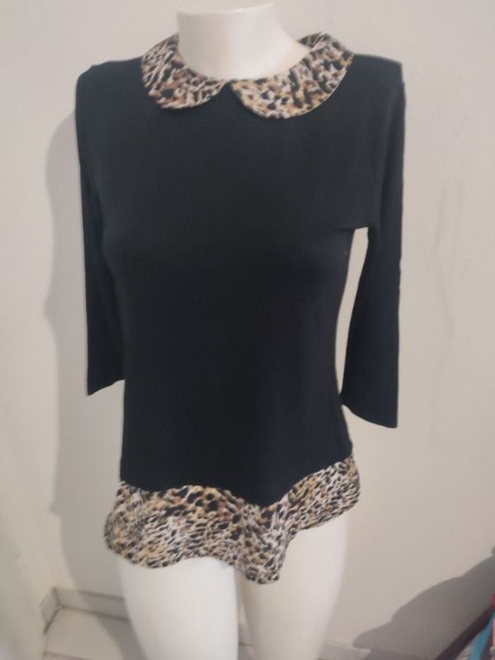 #kytie38femme tunique manche longue legere col jacqueline avec un bouton derriere en parfaite etat fluide mesure épaule à épaule 36 cm tirer au max 42 cm mesure des aisselles 44 cm hauteur 60 cm en voile léopard sur le col et sur le bas du t-shirt tunique se ferme par un petit bouton dans le dos 95% coton 5% élastique réf W25