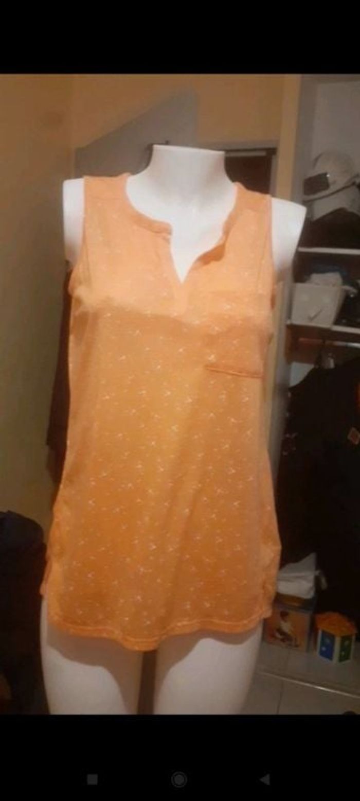 #kytieLfemme lot de 2 haut une tunique orange manche courte col v leger unnpeu juste un peu transparente mais pas beaucoup taille L marque kiabi de c couleur abricot et blanc fluide leger et un debardeur coton bleu marine de marque camaieu les 2 articles sont pratiquement neuf vraiment vraiment superbe etat