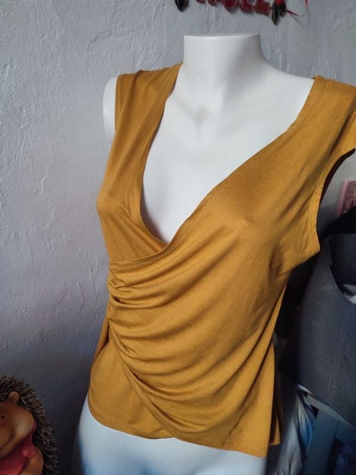 kytieSfemme. Top taille S/M de couleur moutarde état plus que exellent super léger avec drapé ouvert style cache coeur sur le devans longueur du top 50 centimètres de marque prénom collection