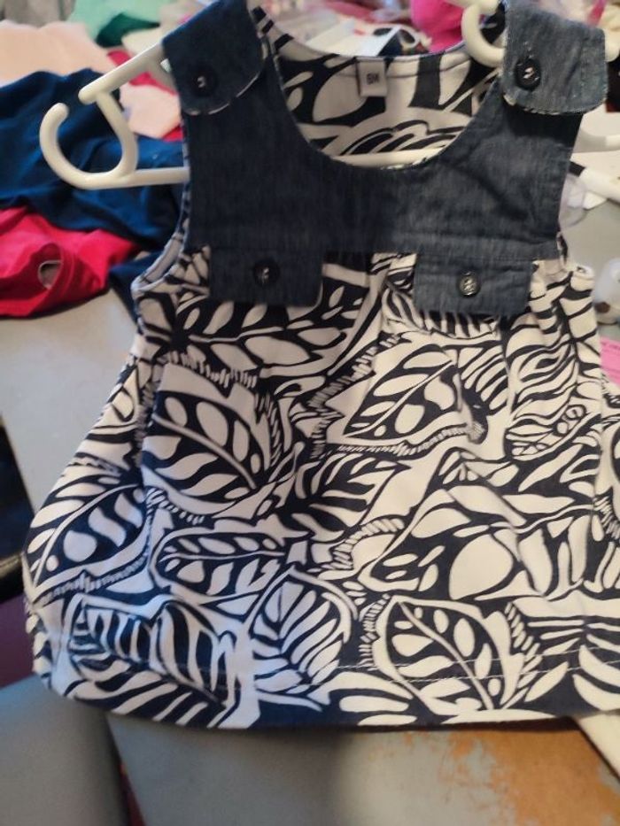 #kytie6moisfille. Ensemble robe débardeur taille 6 mois bleu et blanche se ferme par des boutons sur les épaules avec son Boléro manche longue souple bleu marine se ferme par un petit bouton devans