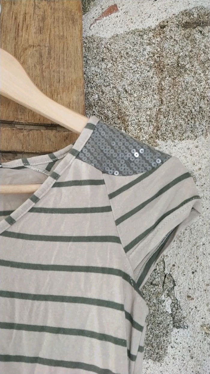 Tee-shirt, tons beige/kaki avec paillettes sur les épaules Taille 1 PROMOD Très bon état #promod #promodtaille1 #taille1 #taille36