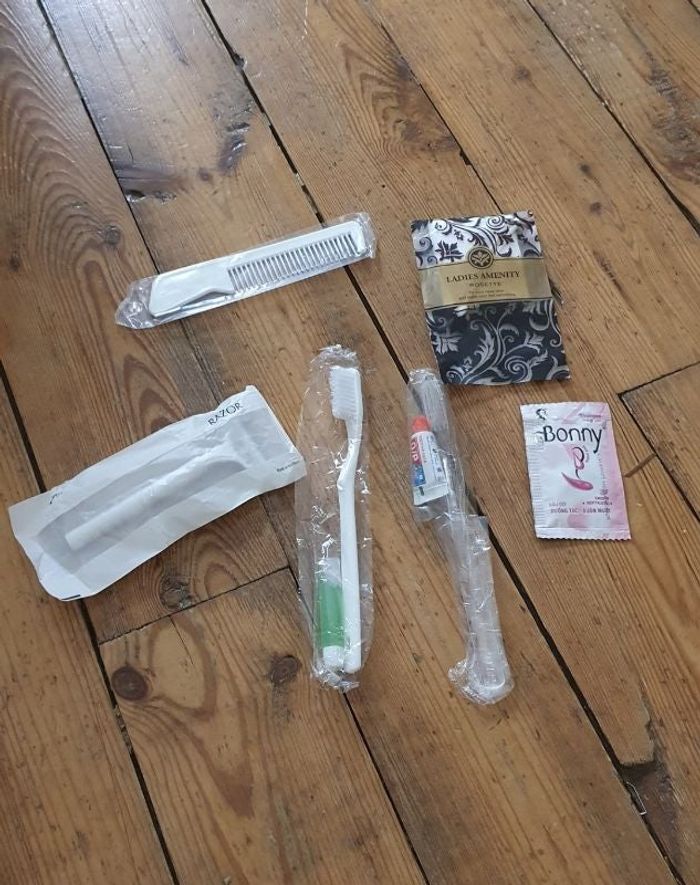 Neuf, contient brosses à dent, dentifrice, shampoing, peigne, rasoir, coton et coton tige, possibilité de faire des lots