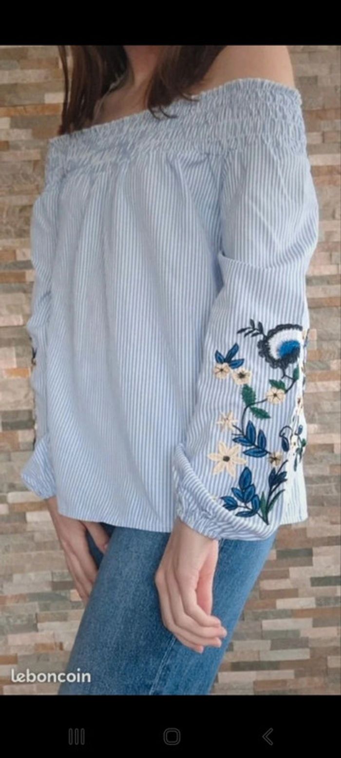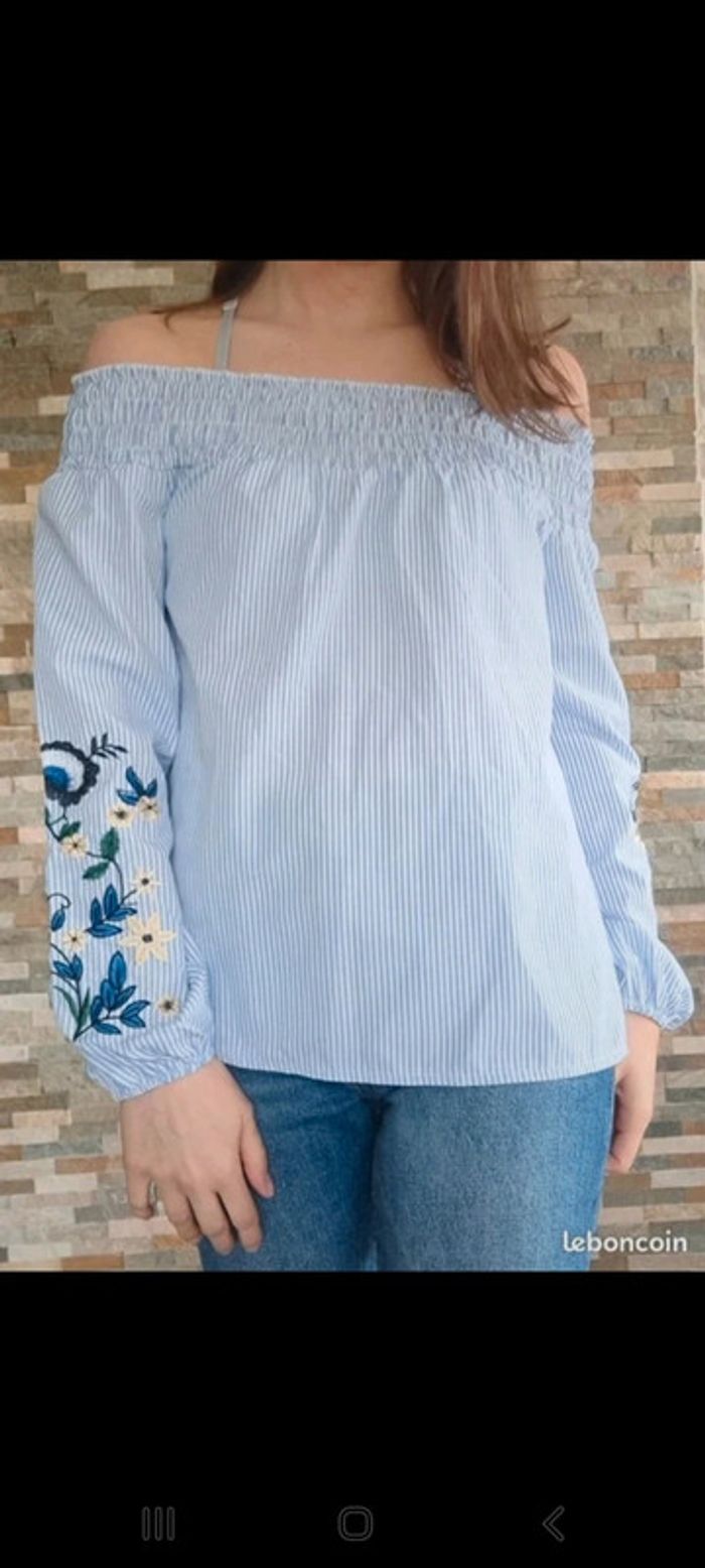 Blouse manches longues et épaules dénudées avec motifs floraux sur les manches. Porté une seule fois en très bon état. De la marque New Look. Taille S.