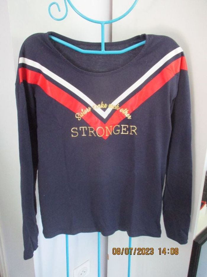Bleu marine rayures rouges et blanches, écritures en doré pailleté TBE 16 ans 59% coton 41% polyester #16_ans_fille_karantho