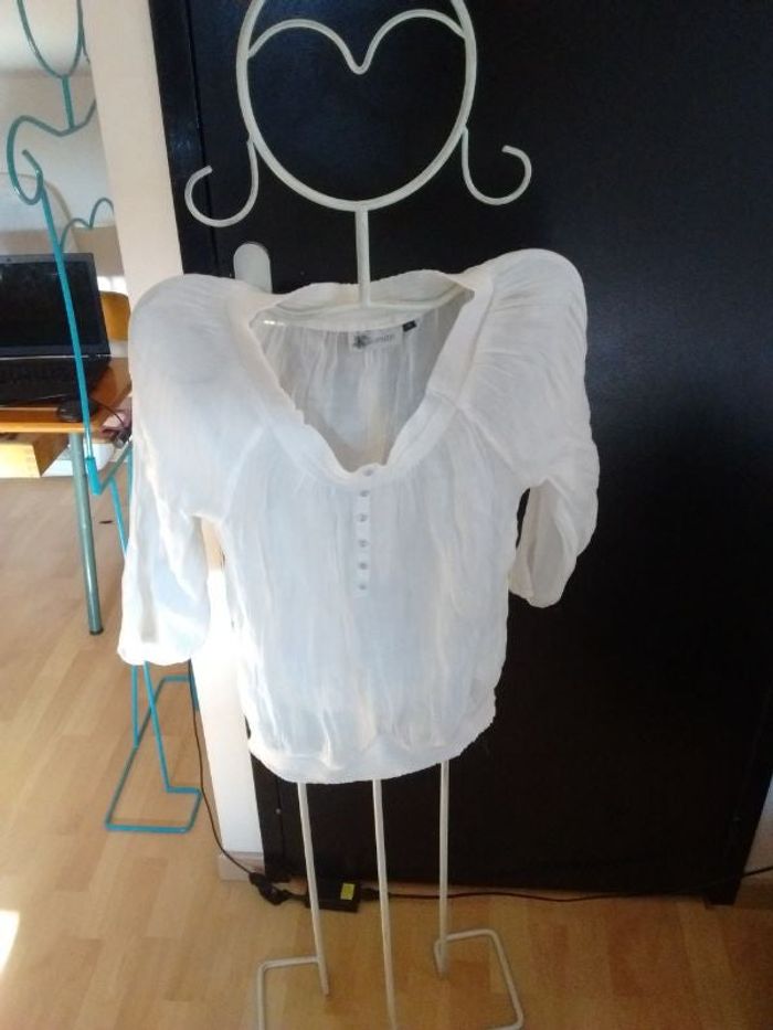 Taille 38 TBE beige Légèrement transparent Manches 3/4 58% viscose 42% polyester #taille_38_femme_karantho #taille_M_femme_karantho