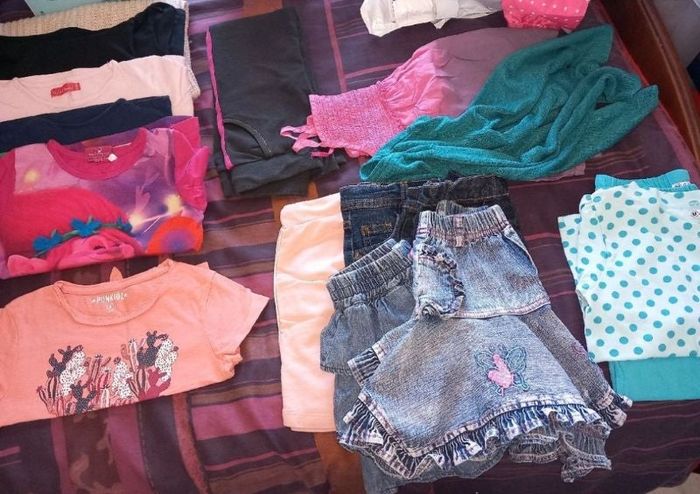 Ce Lot de 15 articles de marques différentes comprends: -1 gros gilet -4 tee-shirts manches longues -1 tee-shirt -5 jupes -1 pantalon -1 tunique/ robe (je ne sais plus) -1 gilet bleu/vert -1 ensemble turquoise à pois D'autres taille et vêtements garçon à vendre également, n'hésitez pas à demander