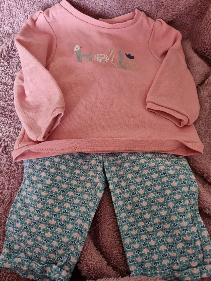 Ensemble de la marque Obaïbi comprenant 1 pantalon léger réglable à la taille 1 pull à manches longues En très bon état Taille : 3 mois / 59 cm