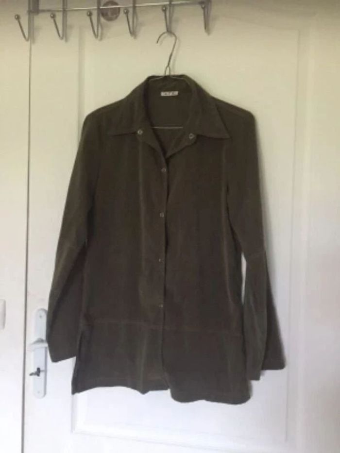 Veste Surchemise suédine kaki l’an 2 Mim, taille 36-S, longueur 72 cm, aisselles 46 cm, surpiqûres orange, fermeture 5 pressions, col impeccable, fente de chaque côté, polyester élasthanne - TBE
