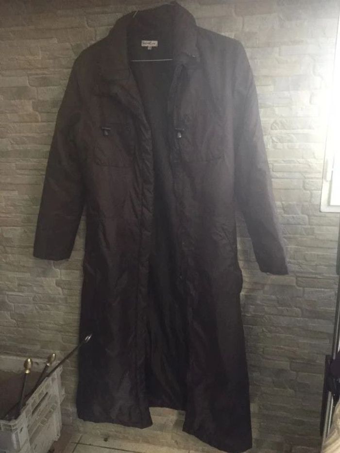 Manteau long matelassé marron Machin Chose, taille 38, longueur 124 cm, largeur épaules 46 cm, largeur aisselles 52 cm, 100% polyester - TBE