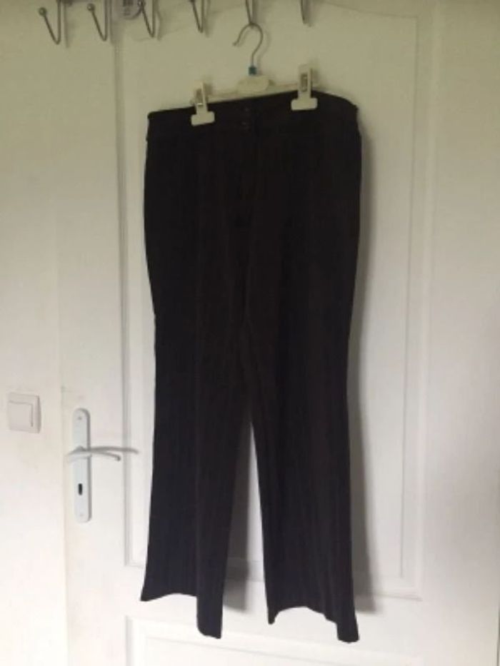 Pantalon évasé marron, noté 42 mais (plutôt un 38 ! ), cause largeur ceinture à plat 38 cm, fines rayures ton sur ton, longueur 93 cm, largeur hanches à plat 48 cm, 65% polyester, 30% viscose, 5% élasthanne - TBE