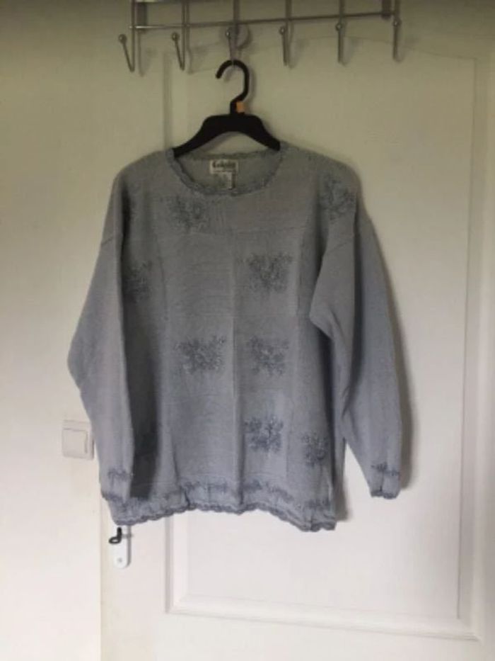 Pull tunique bleu grisé Exclusive Imports, taille L, longueur 66 cm, largeur aisselles 58 cm, petites perles blanches, 60% ramie “lin oriental”, 30% coton, 10% rayonne - Protection poche hermétique - TBE