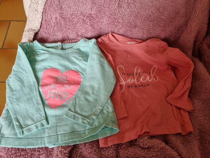 Lot de 2 tee-shirts manches longues fille 3 mois. Le tee-shirt turquoise est de la marque Tape à l'œil et s'ouvre entièrement derrière avec des pressions Le tee-shirt rose est de la marque Kiabi avec 2 boutons sur l'épaule En très bon état