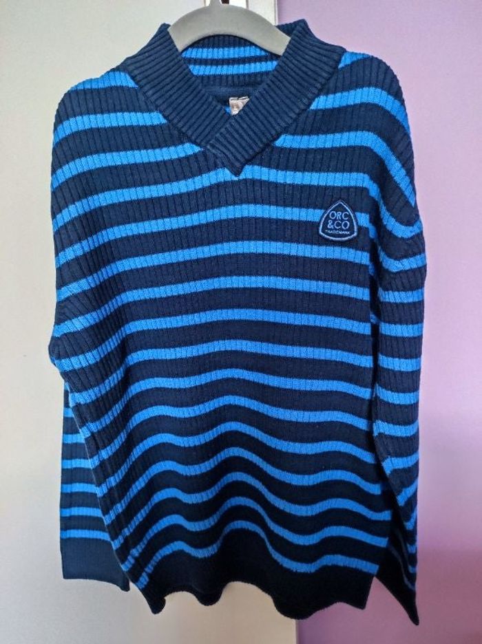 Pull garçon col qui se croise et un peu marqué avec le temps mais sa ne se voit pas beaucoup pull pas très épais mais je le mettais avec un gros manteau en bon état pas déchiré désolé si c'est un peu froissé c'est rangé dans des bacs