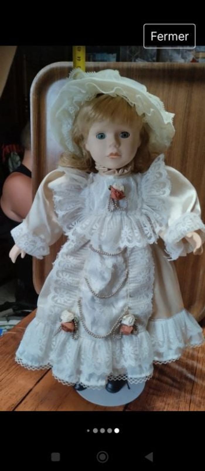 Poupée porcelaine blonde 43 cm vendue avec son pied