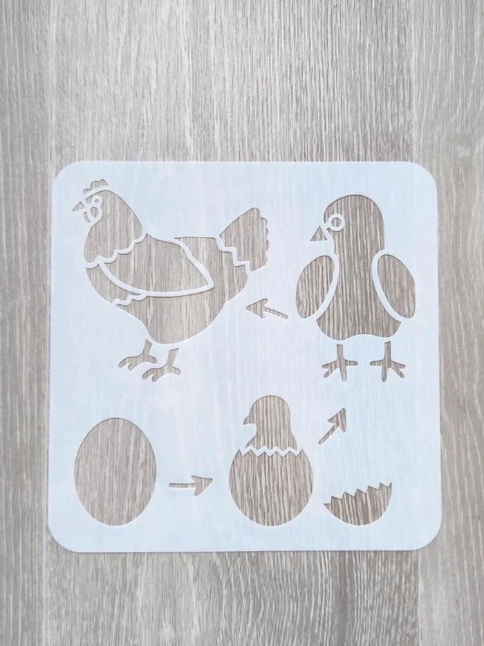 📍Pochoir du cycle de vie de la poule. 📍Taille : 20 x 20 cm 📍Neuf. 👉Pour trouver d'autres pochoirs c'est par ici : 🔎#elisabethDesignPochoir 📫⏳ Envoi rapide et soigné le jour même de l'achat dans la mesure du possible! 🤝 Frais de port ajusté au plus bas.