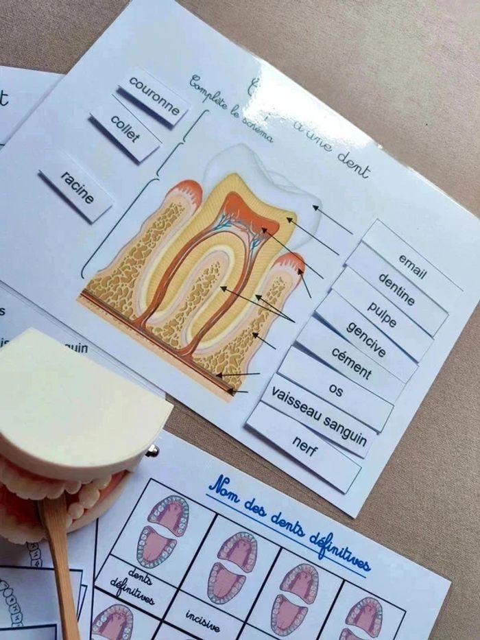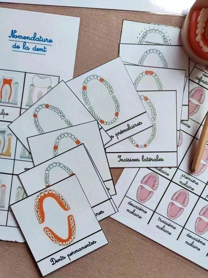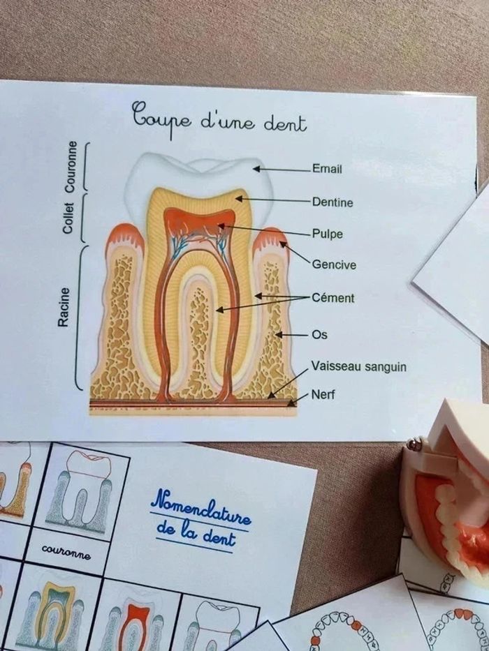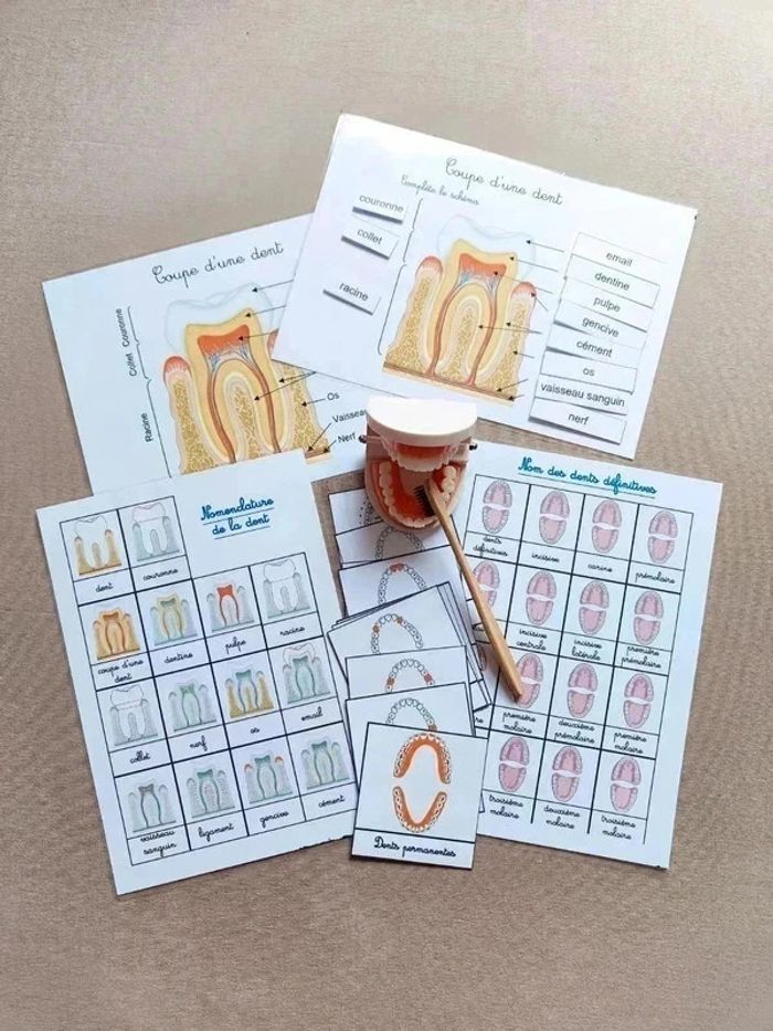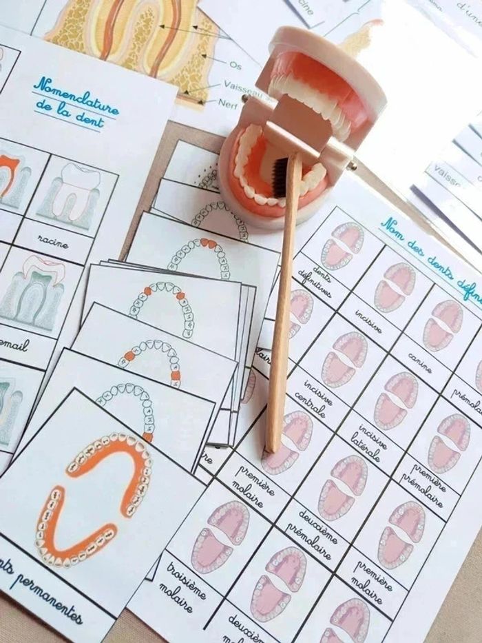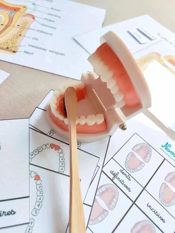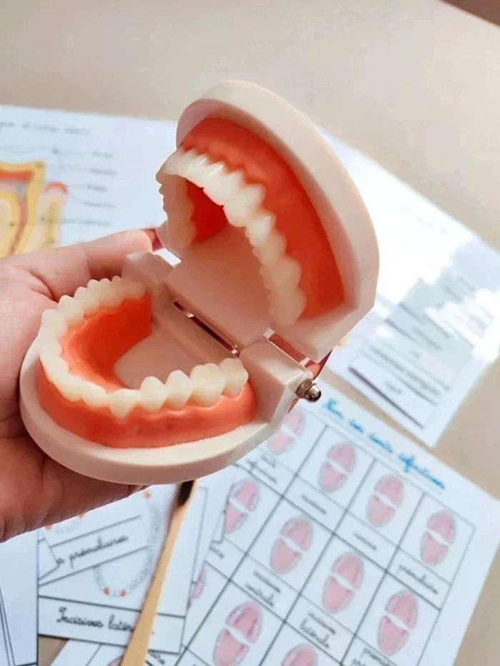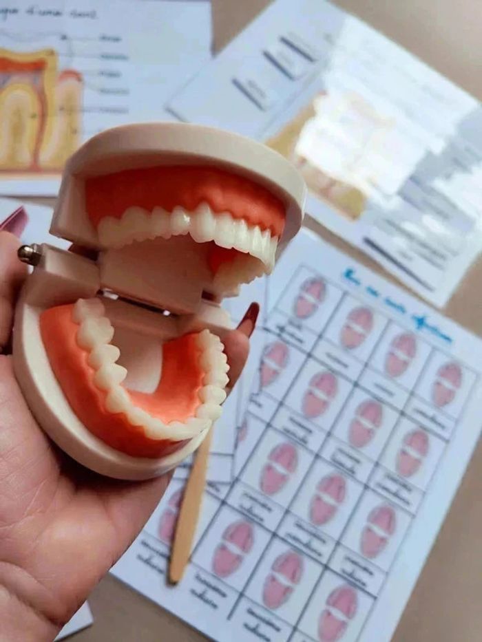 📍Kit anatomie de la mâchoire. 📍1 Véritable dentier articulé. 📍1 brosse à dents. 📍11 cartes de nomenclature. 📍2 fiches de nomenclature des dents. 📍1 fiche coupe de la dent avec légendes. 📍1 fiche coupe de la dent à scratch. 📍Papier 250G plastifié pour une bonne tenue ! 📍Neuf. 👉Pour trouver d'autres activités c'est par ici : 🔎#elisabethdesignCorpsHumain 📫⏳ Envoi rapide et soigné le jour même de l'achat dans la mesure du possible! 🤝 Frais de port ajusté au plus bas.