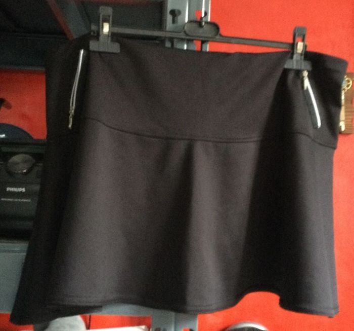 jupe noir, taille 54/56, 93% polyester, 7%élasthanne, longueur de la ceinture: 51 cm. envoi rapide et soigne.