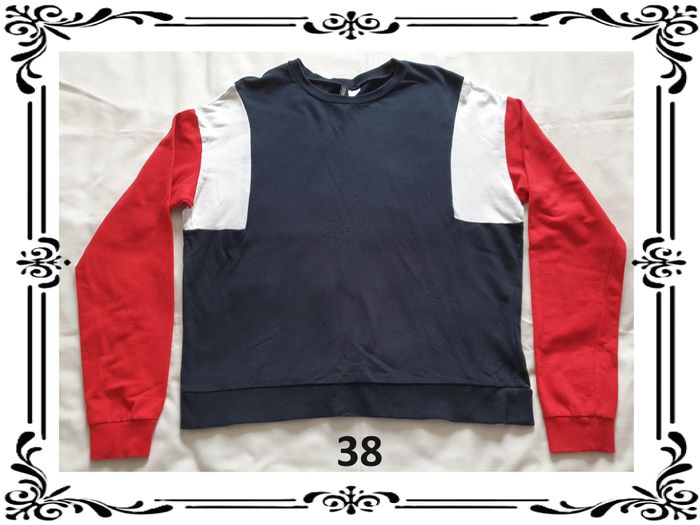 Pull léger taille 38. Pull léger bleu marine, rouge et blanc. Tissu extensible sur 6 cm. 100 % coton. Largeur d'épaule à épaule: 55 cm Largeur sous les bras : 55 cm Hauteur du décolleté à partir des épaules: 6,5 cm Longueur totale: 59 cm Longueur des manches: 57 cm En très bon état. H&M. 3€. #vero38110vetementsfemme38