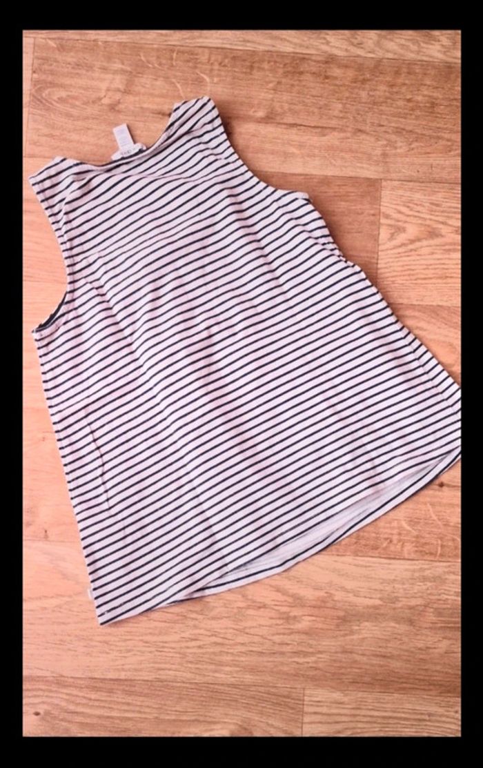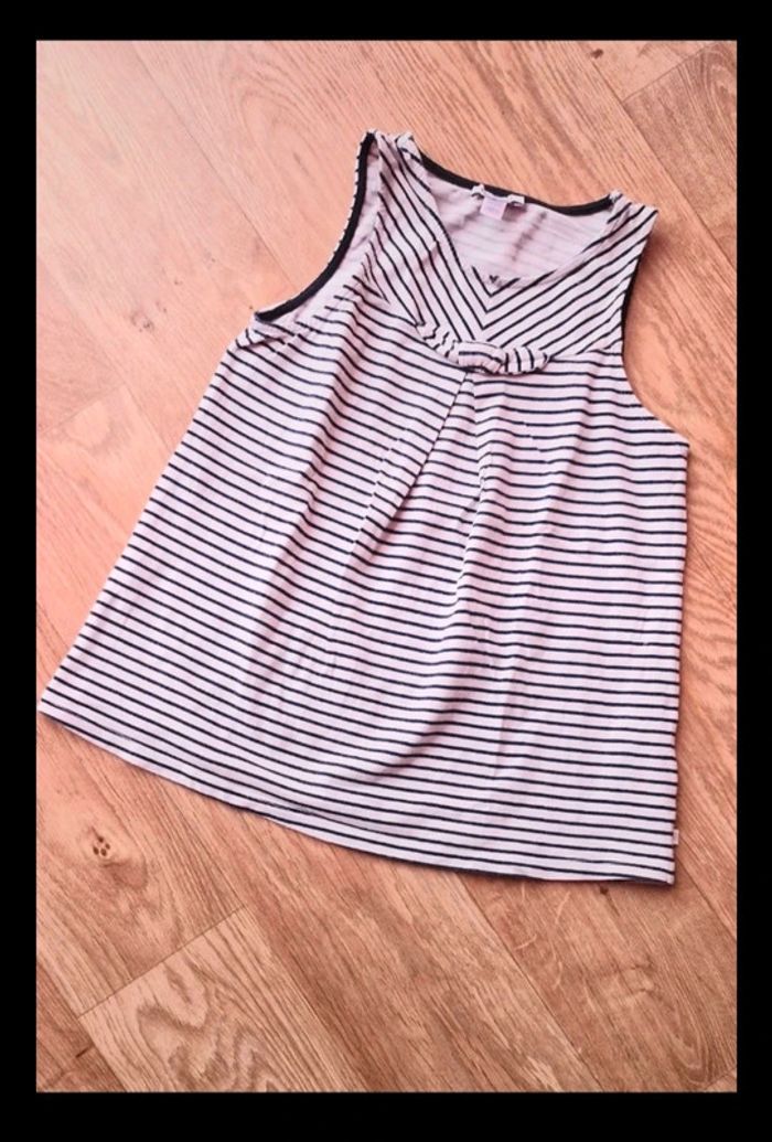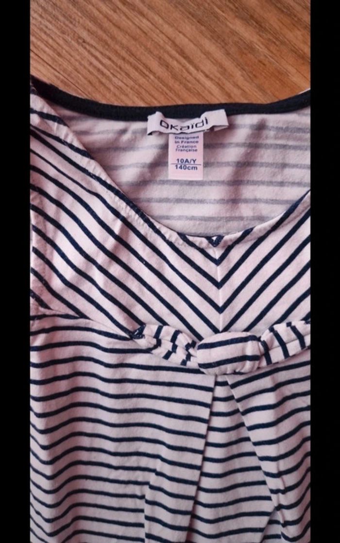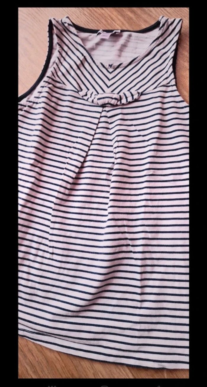 #Mi_laine10ansfille #okaidifille T shirt sans manche Motif rayé bleu marine et blanc. Motif nœud sur le devant Haut plutôt ample. Vetements premières mains et réduction automatique dès le 2eme article