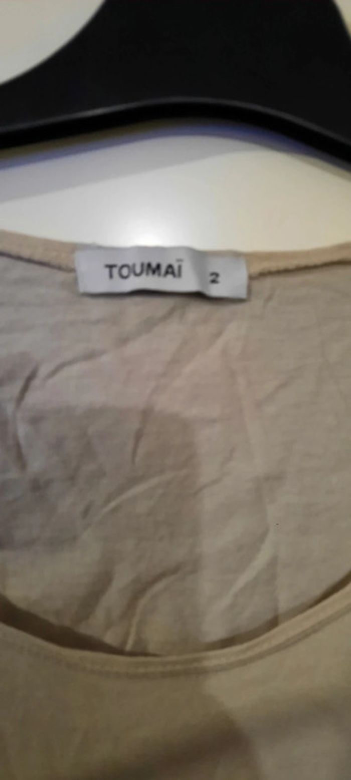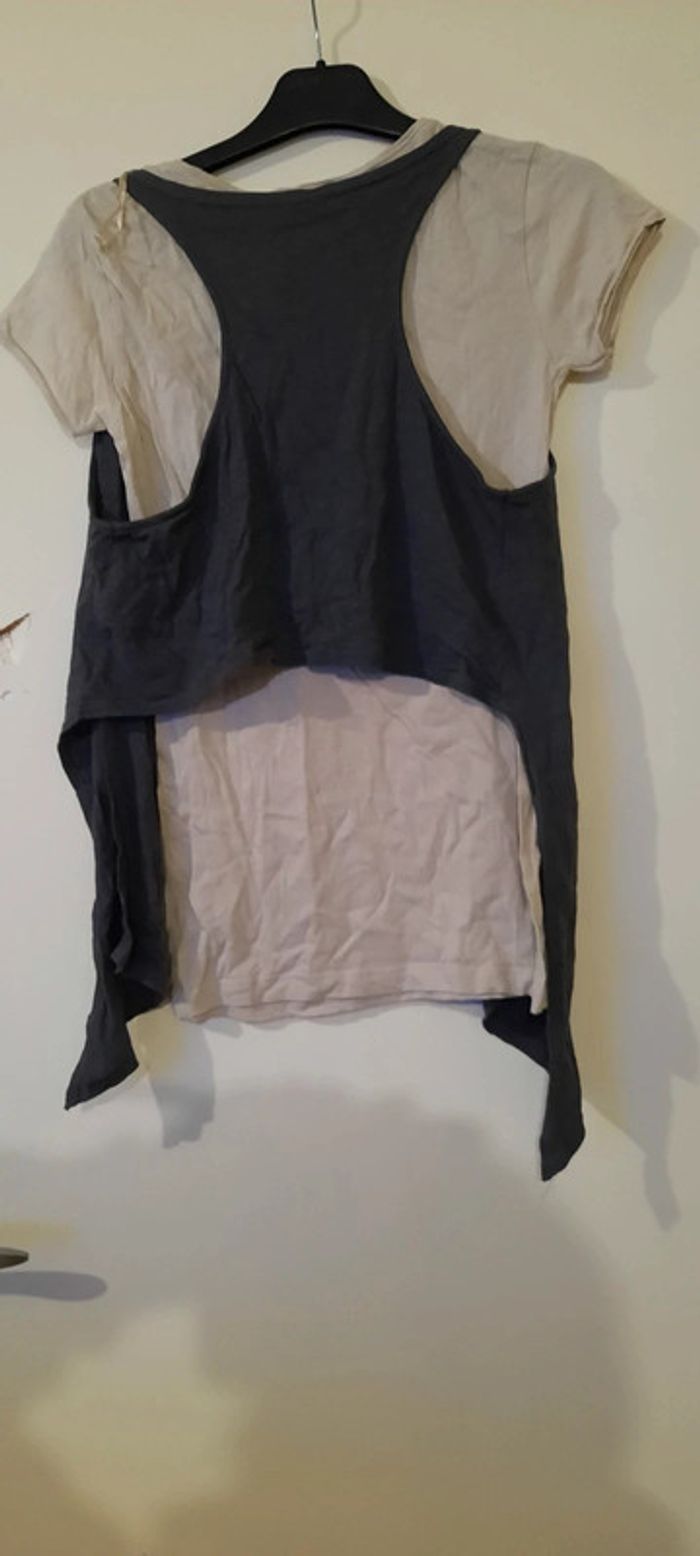 Joli petit t-shirt 2 en 1 avec un t-shirt beige manches courtes plus un petit gilet gris cousu par dessus modèle très sympa avec imprimé un sac à main. Marque toumai Taille 2 #tatagwenm