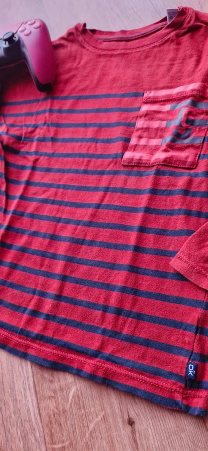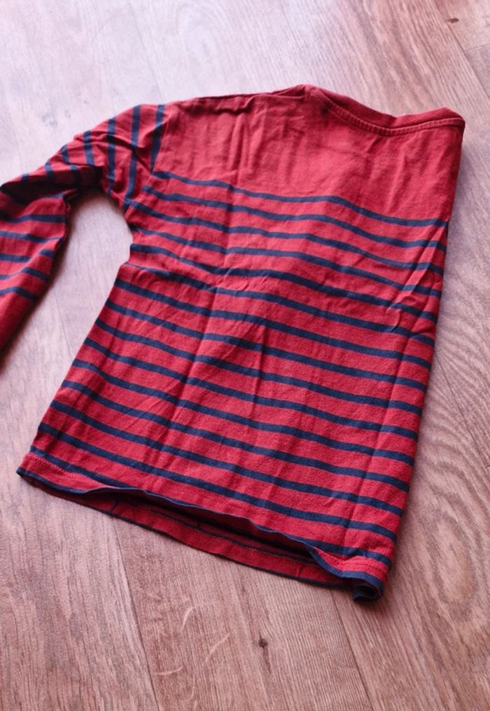 #Mi_laine8ans T shirt manches longues avec motifs façons marinières avec manches 3/4. De coloris rouge et bleu marine. Motif poche sur le devant. La couleur rouge légèrement blanchit (voir les photos). =>Réduction dès 2 articles achetés, cliquez sur le lien en haut du descriptif de cette article pour afficher la collection 8 ans.