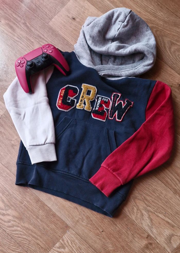 #Mi_laine8ans Pull épais de coloris bordeaux, blanc, marine .. Possède une poche ventrale, ainsi qu une capuche de coloris grise. La manche blanche ainsi que le tour de poignée ont grisonné à cause du lavage avec le reste du pull coloré mais rien de très flagrant (voir les photos). Motif sur le devant du pull. =>Réduction dès 2 articles achetés, cliquez sur le lien en haut du descriptif de cette article pour afficher la collection 8 ans.
