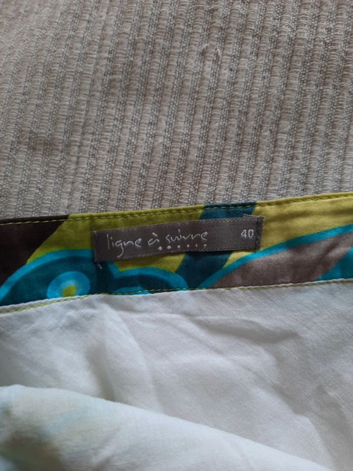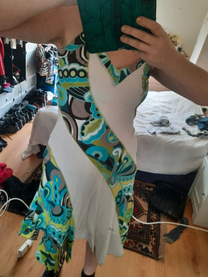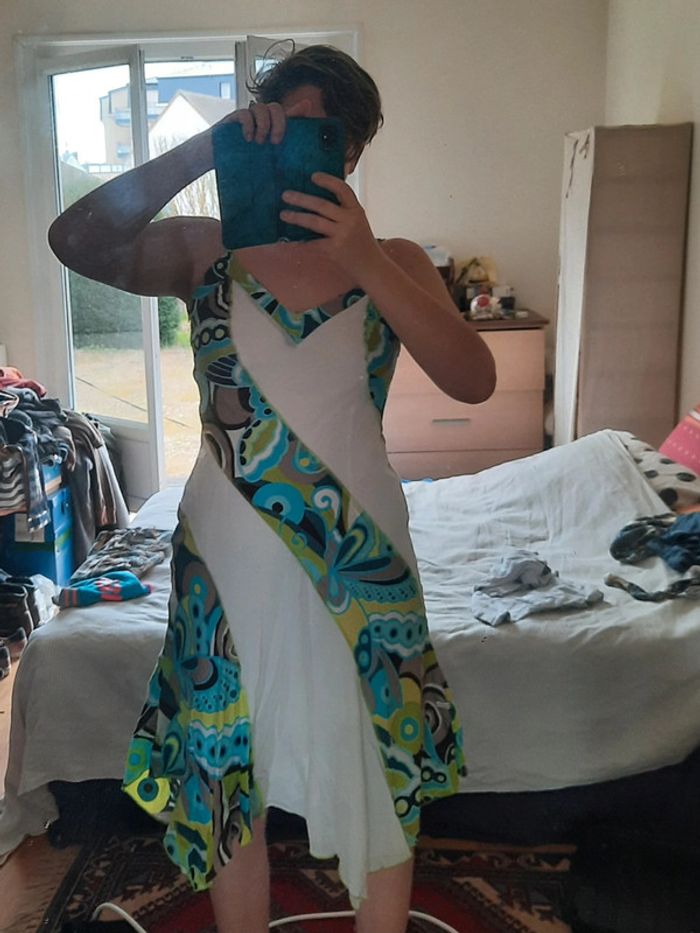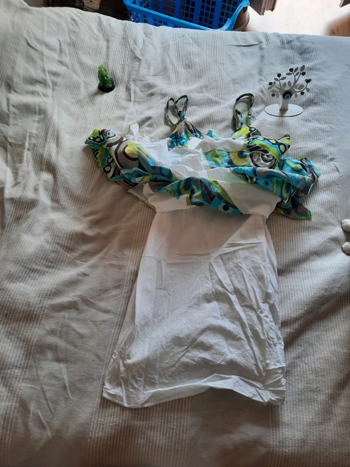 Très jolie robe blanche avec du turquoise et vert, elle a un jupon.