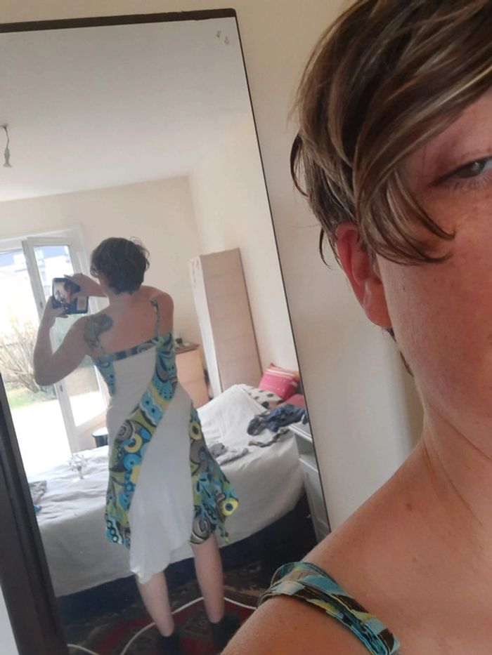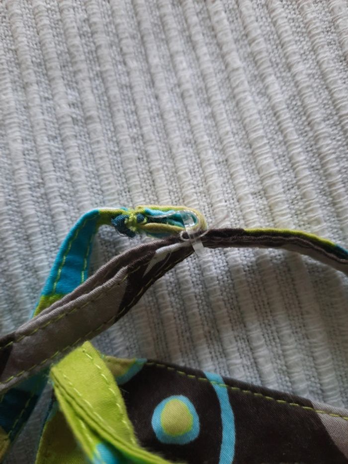 Petit défaut au niveau des bretelles il y en a une qui ne tient pas bien il faudrait une petite réparation ou faire un point à la hauteur voulu.