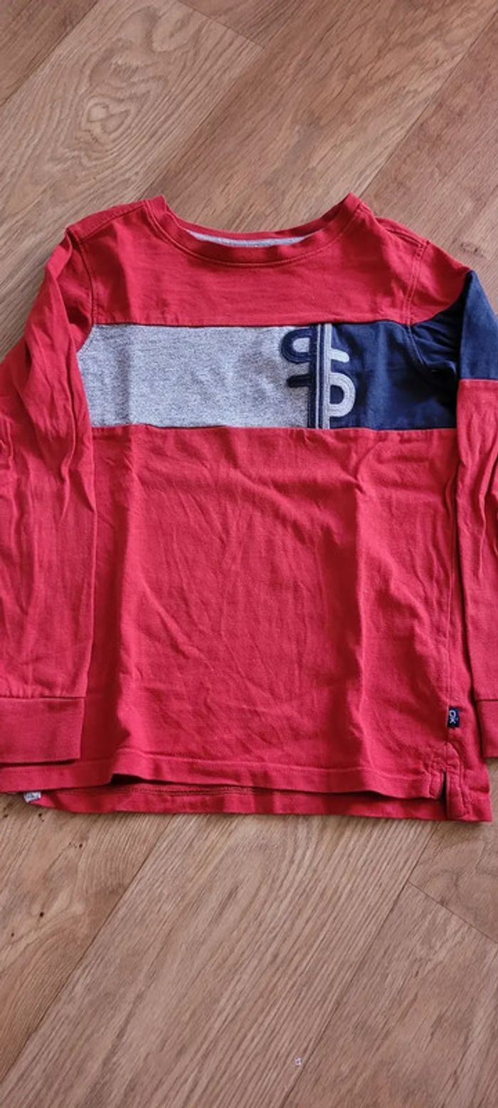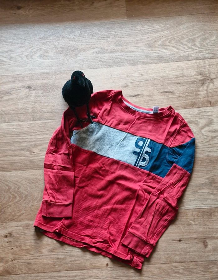 #Mi_laine6ans T shirt manche longue. De coloris rouge/gris/bleu marine. Motif en bande grise et bleu sur le devant du haut.