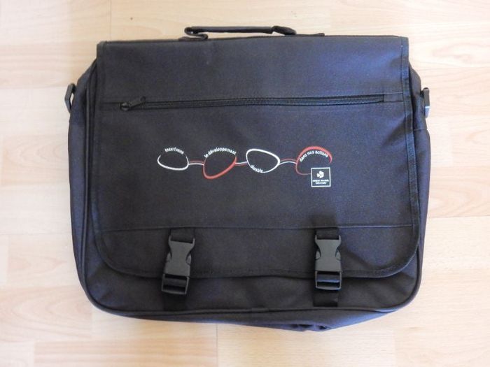 Sacoche noire avec diverses pochettes notamment pour mettre des dossiers ou un ordinateur, des crayons et autres... Dimensions : Largeur 40cm / Hauteur 33cm / Profondeur 10cm