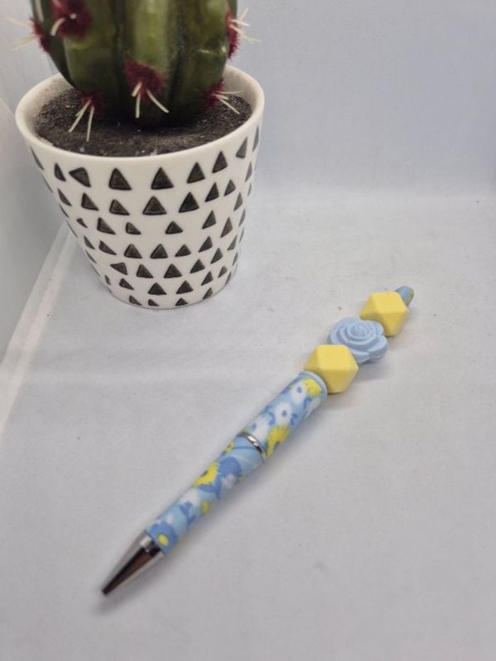 Stylo fleurs 🌼 Perles en silicone 💙💛 Couleur encre : noire 🖊️ #papeterie #écriture #fleurs #bleu #jaune #noir
