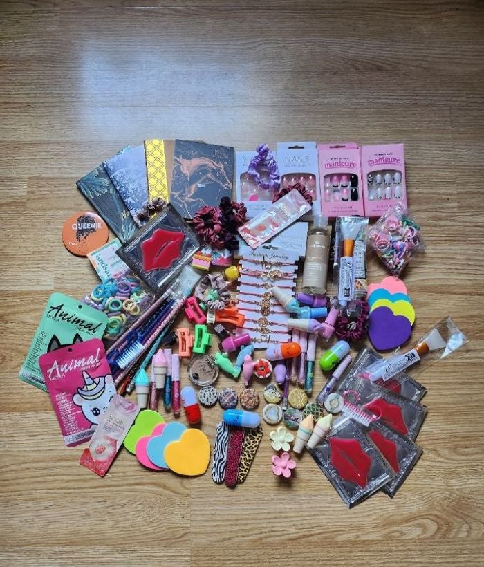 Boite mystère 5 articles au hasard Vous pouvez trouver : - bijoux (boucles d'oreilles, bracelet, collier...) - accessoire cheveux - accessoire papeterie (Gomme, bloc note, crayon à papier, marque page...) - maquillage (fard à paupières, gloss, vernis à ongles...) -produits de beauté Merci de me préciser votre couleur préférée, j'essaierai de mettre un max d'articles avec votre couleur. Articles aléatoire Tout n'est pas sur la photo