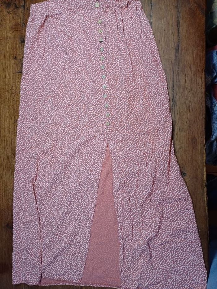 Jupe fleurie fendue mi jambe, bouton déco , élasticité à la taille, acheté sur marché. Portée quelquefois. Aucun defaut