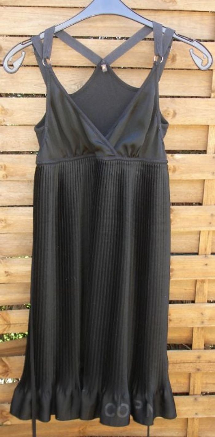 Robe plissée et doublée. Dos croisé. Décolleté cache-coeur et bretelles entrecroisées réglables. Deux liens en tissu à nouer autour du buste pour le souligner. La base de la robe est terminée par un volant sur lequel la marque COP COPINE est inscrite ton sur ton. Largeur poitrine à plat : 43 cm environ Longueur : 87 cm environ Robe en lyocell + coton + élasthanne Couleur : noir Taille : 38 En excellent état. Envoi rapide et soigné.