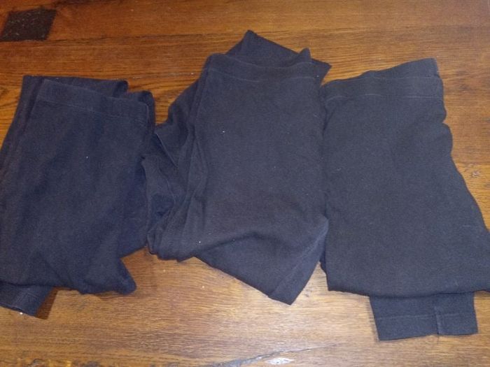 Trois leggings noirs il y en a un qui a un micro trou sur le haut de la jambe droite les deux autres sont légèrement troués aux fesses peuvent encore servir pour jouer dehors ou avec une tunique les jambes sont en bon état