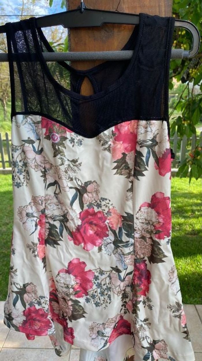 Tunqiue sans manches fleurs et empiècement noir Cintée à la taille longueur devant 60 cm longueur derrière 70 cm Très seyante