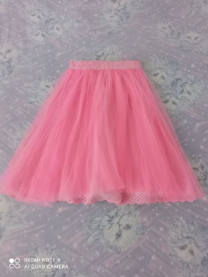 Bonjour 🙂 Jupe en tulle doublée, taille 10 ans. Présence d'une légère coloration sur une zone de la ceinture (photo 5) dû à un transfert de couleur d'un haut. Colis soigné 📦😉