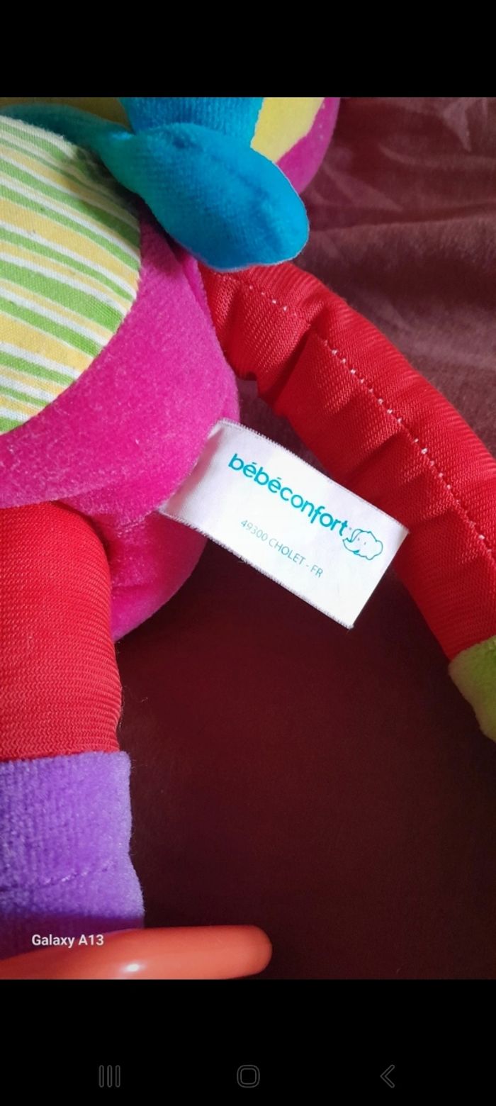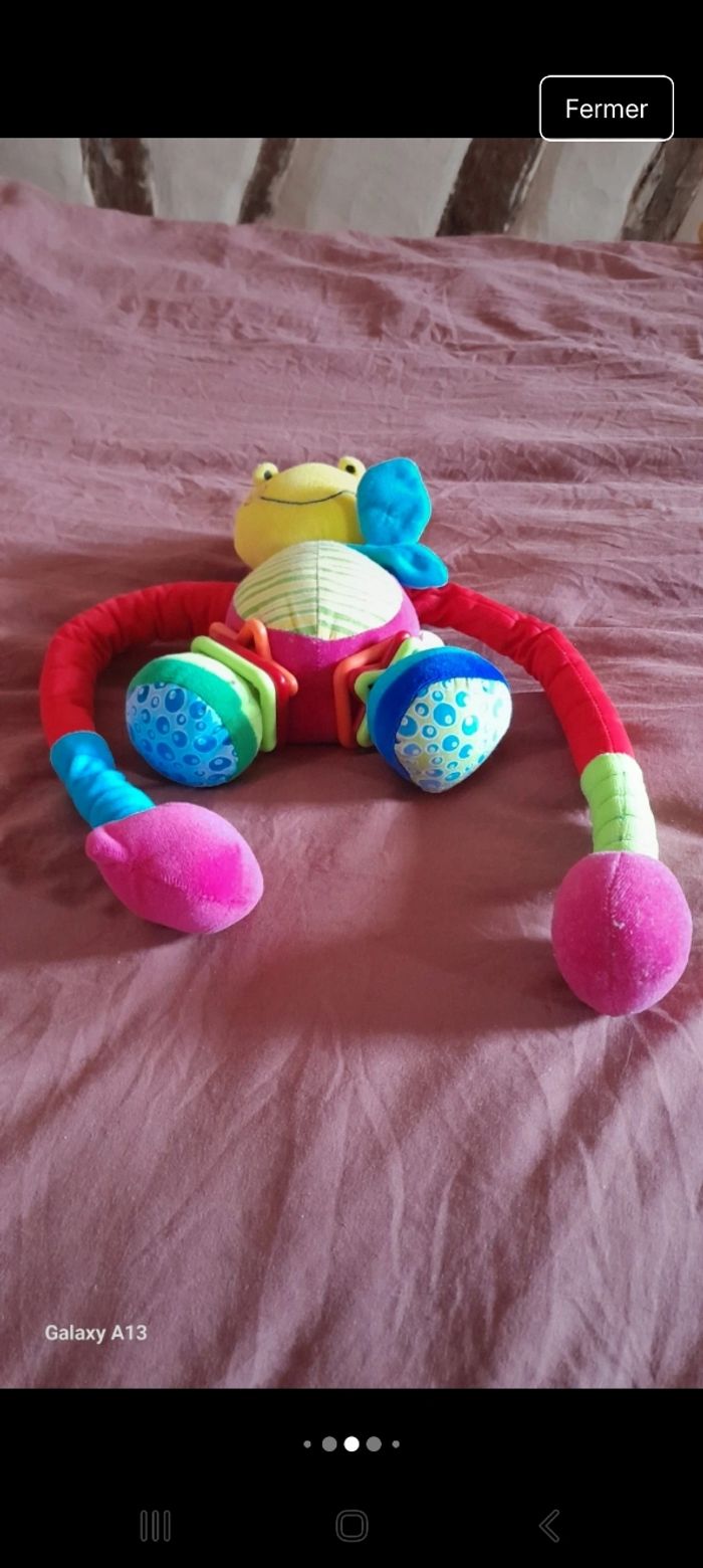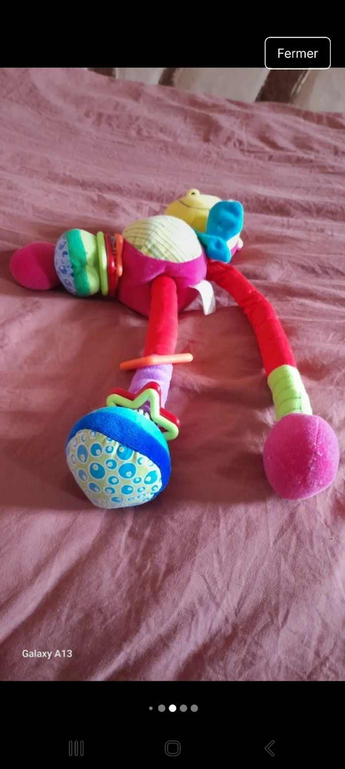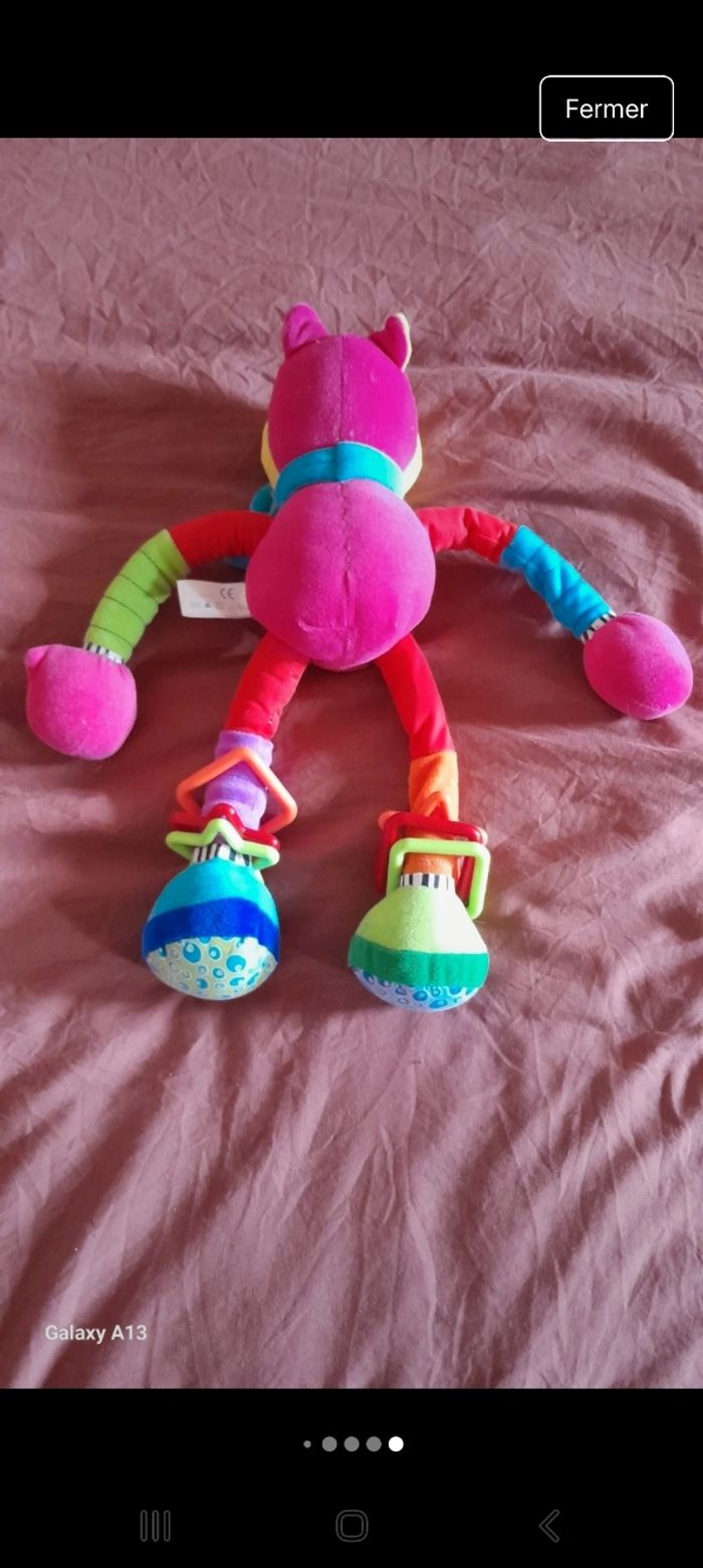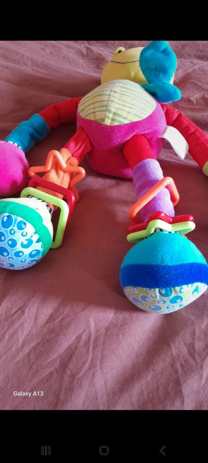 Jouet d'éveil et d'activité hippopotame "hippo fou" : matière douce et colorée, les bras et les jambes grandissent ou rétrécissent lorsqu'on tire dessus et il y a des anneaux de différentes formes et couleurs qui font un léger bruit.