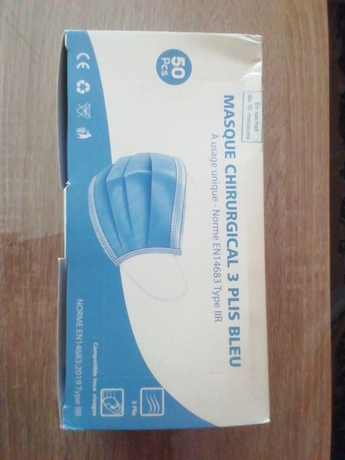 Boîte de masques chirurgicaux, neufs, emballés par sachets de 10,