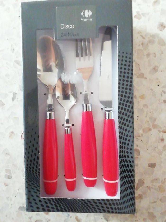 Ménagère neuve, 24 pièces, inox, Carrefour Home, coloris des manches rouge, jamais ouvert