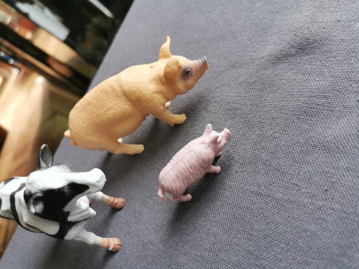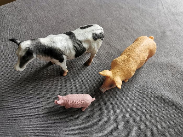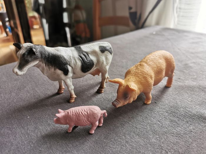 Figurines lot de 3 animaux de la ferme, non dissociable et comprend : 2 cochons de 4,5x2 cm et 9x5 cm et une vache de 10x6,5 cm, le poids du lot fait 60g. Les figurines sont en très bon état, faites dans une sorte de résine rigide. #figurines #animauxdelaferme #cochon #vache