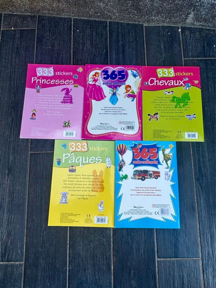 Lot de 5 Livres Stickers pour Enfants : - Sur les Chevaux 333 autocollants - Sur les Princesse 333 autocollants - Sur les Fées, animaux 365 autocollants - Sur les Lapins de Pâques 333 autocollants - Sur les dinosaures, engins, animaux 365 autocollants Ils sont en bon état, dans certains ils manquent quelques autocollants mais la plupart ne sont pas utilisés #livresvvirg5