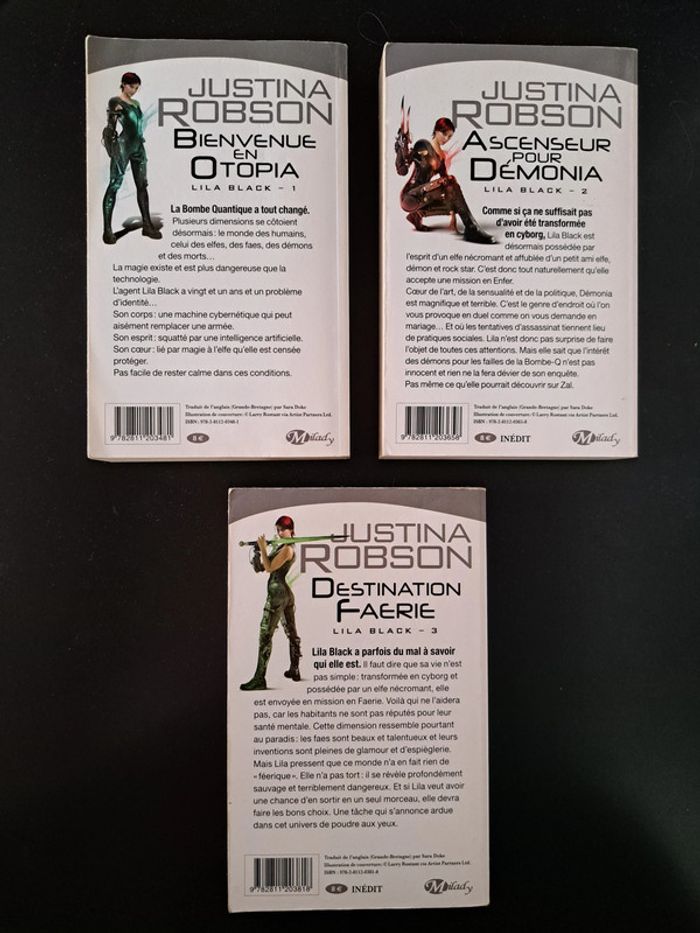 Justina ROBSON Lila Black 1 Bienvenue en Otopia 2 Ascenseur pour Démonia 3 Destination Faerie 6 € la série Possibilité de remise en mains propres sur Paris et certaines banlieues (Charenton-Le-Pont, Fontenay-sous-Bois, Vincennes, Saint-Mandé...), et de frais de port à 0.99€ quelque soit le poids pour la France (me contacter) vampires#demons#loupsgarous