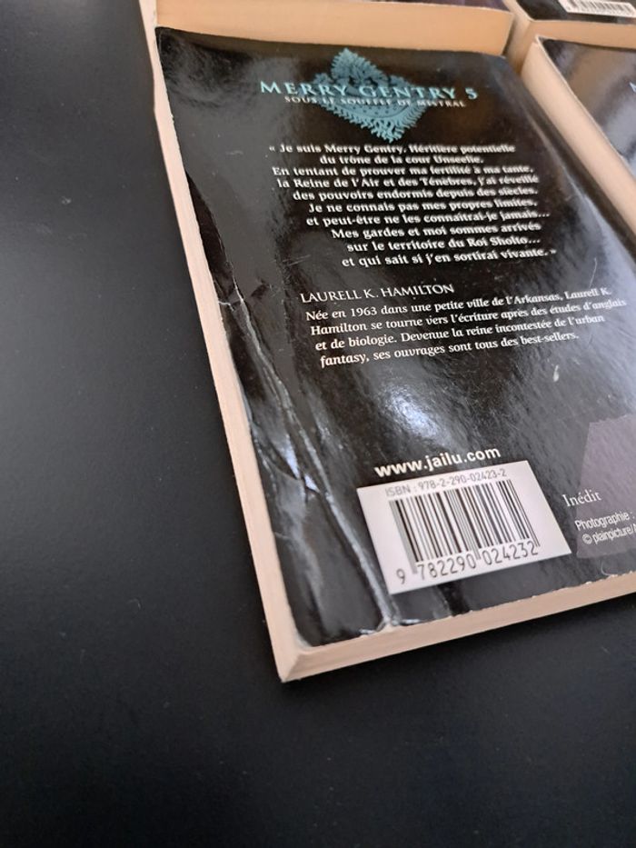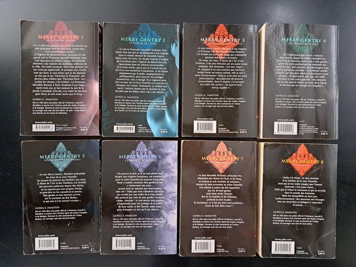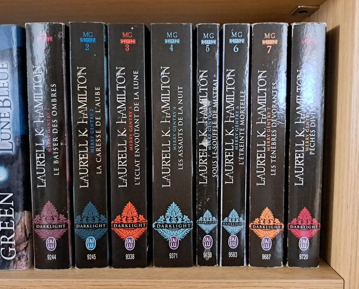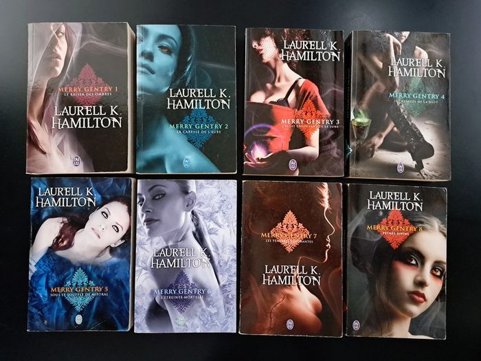 Laurell K. HAMILTON Merry Gentry 8 tomes 1 Le Baiser des Ombres 2 La Caresse de l'Aube 3 L'éclat envoûtant de la Lune 4 Les Assauts de la Nuit 5 Sous le Souffle de Mistral 6 L’Étreinte Mortelle 7 Les Ténèbres Dévorantes 8 Péchés Divins 25 € la série N'oubliez pas d'aller voir mes autres articles, je fais un grand tri. Possibilité de remise en mains propres sur Paris et certaines banlieues (Charenton-Le-Pont, Fontenay-sous-Bois, Vincennes, Saint-Mandé...), et de frais de port à 0.99€ quelque soit le poids pour la France (me contacter)