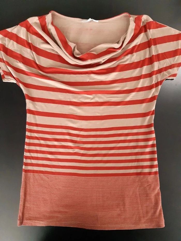 Rayé. Col bénitier. Taupe et bordeaux. Possibilité de remise en mains propres sur Paris et certaines banlieues (Fontenay-sous-Bois, Vincennes...), et de frais de port à 0.99€ quelque soit le poids pour la France (me contacter).