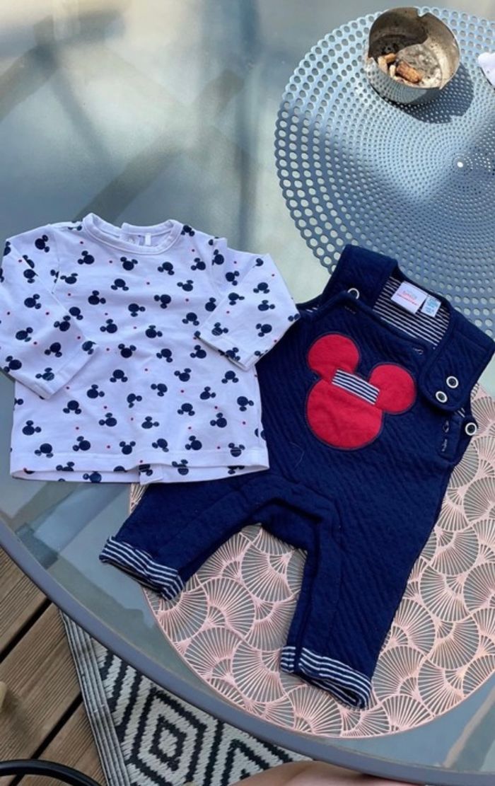 Ensemble Mickey salopette + haut manches de la marque Orchestra en 1 mois, longues portée une fois pour la sortie de la maternité