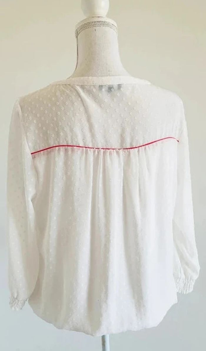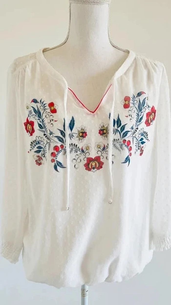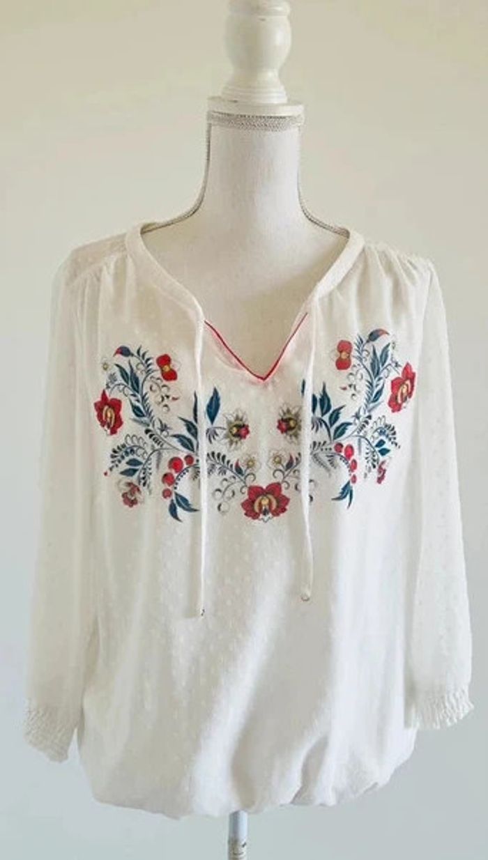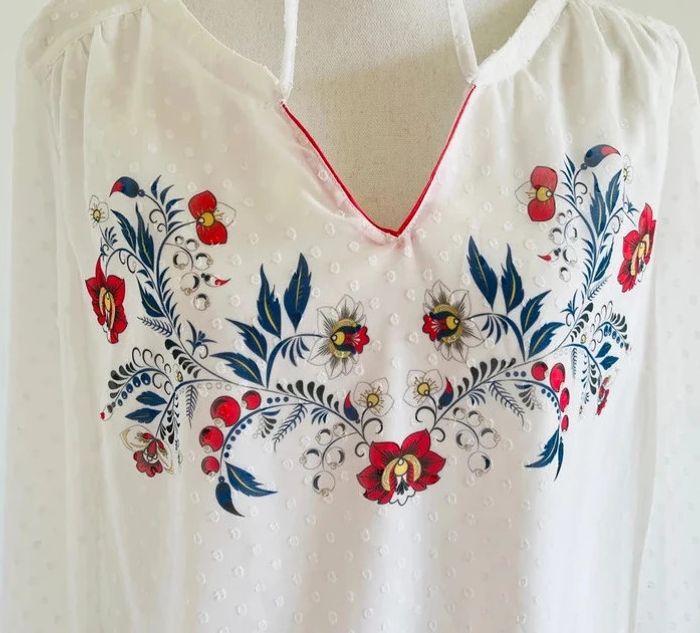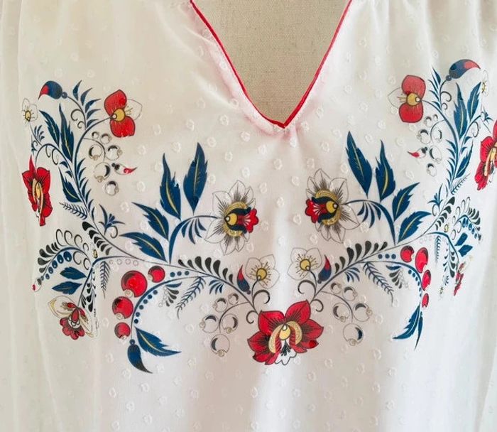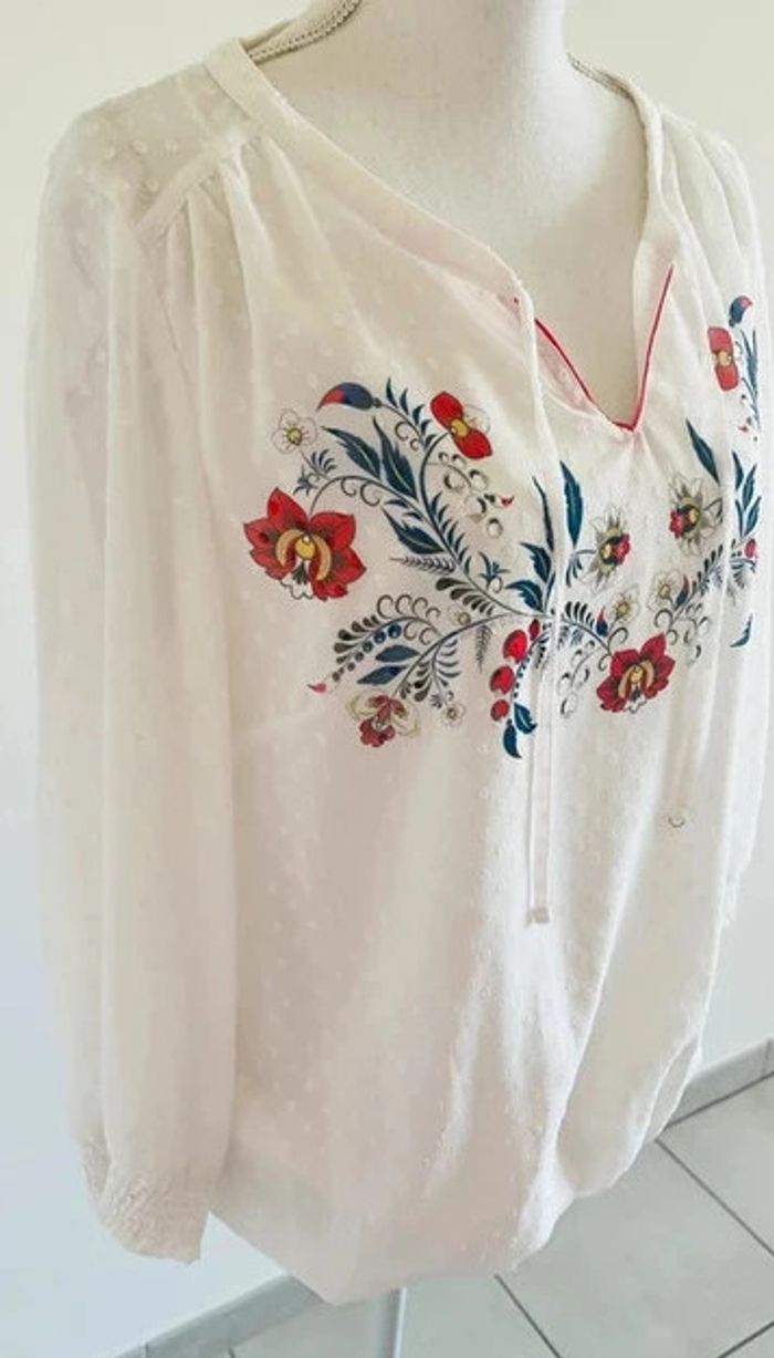 Blouse blanche avec des motifs de fleurs Jacqueline Riu Taille 42 Il a été porté 1 fois il est en très bon état C'est de la très bonne qualité Magnifique pièce Serré à la taille 28€ #SHOPBYMELTAILLE42