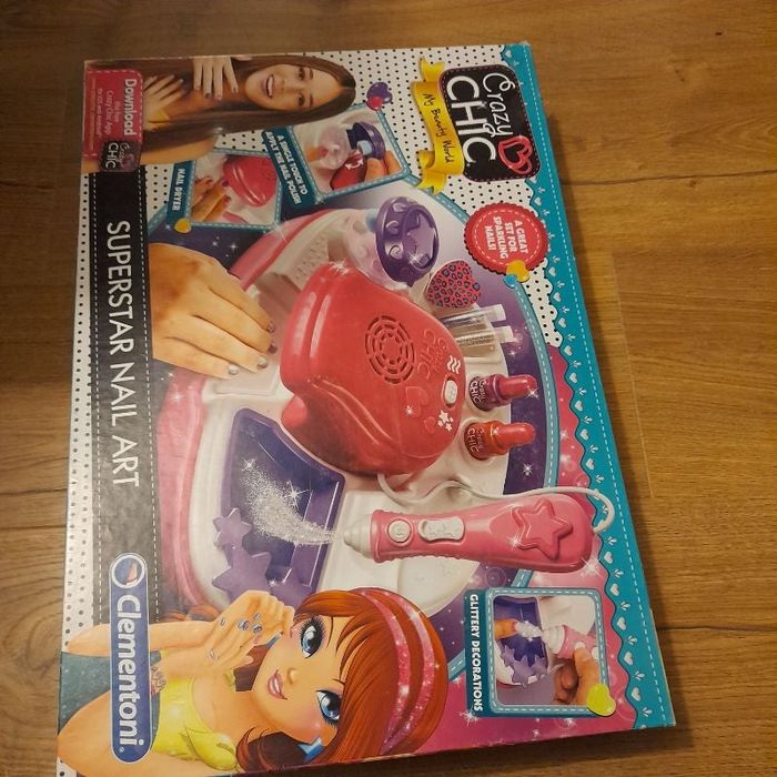 Comprend un plateau pour poser les différents accessoires, un mini plateau pour recueillir les paillettes, 5 pochoirs d'ongles, un pistolet pour projeter les paillettes fonctionne à piles (fournies), 2 lots de 6 embouts en mousse (en manque un sur l'un et une trace de vernis sur un autre), un entonnoir, une plaque d'autocollants, une lime forme cœur, 2 flacons de paillettes,le mode d'emploi. Manque les vernis.