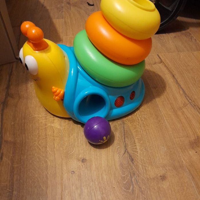 Escargot avec 3 anneaux à empiler et une balle à mettre dedans, fait des bruits et lumières, quand on appuie sur le bouton les anneaux tombent et la balle sort. Marque d'usure type peinture des yeux qui s'effacent et griffures sur le plastique.