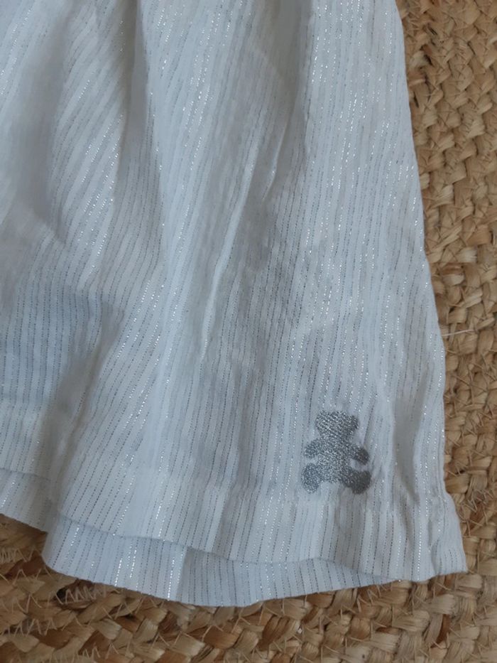 Robe blanche avec fils argentés Achetée neuve à 17,99€ Portée 1 seule fois 2 ans #anthonyagnes_bebe24M "Quelle élégance cette robe LuluCastagnette ! Une robe de cérémonie bébé fille ornée de fines rayures pailletées et d’un empiècement brodé sur l’avant du buste. Cette robe sans manches possède de larges bretelles avec finitions festonnées qui se rejoignent dans le milieu du dos. On aime le petit ourson Lulu brodé en fil pailleté dans le bas de la jupe. Une robe de fête à associer à une jolie paire de ballerines. Col rond."